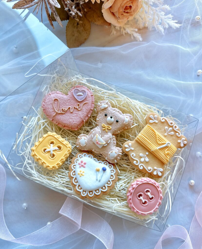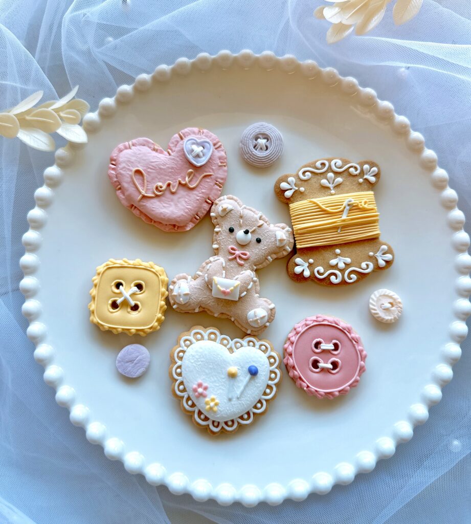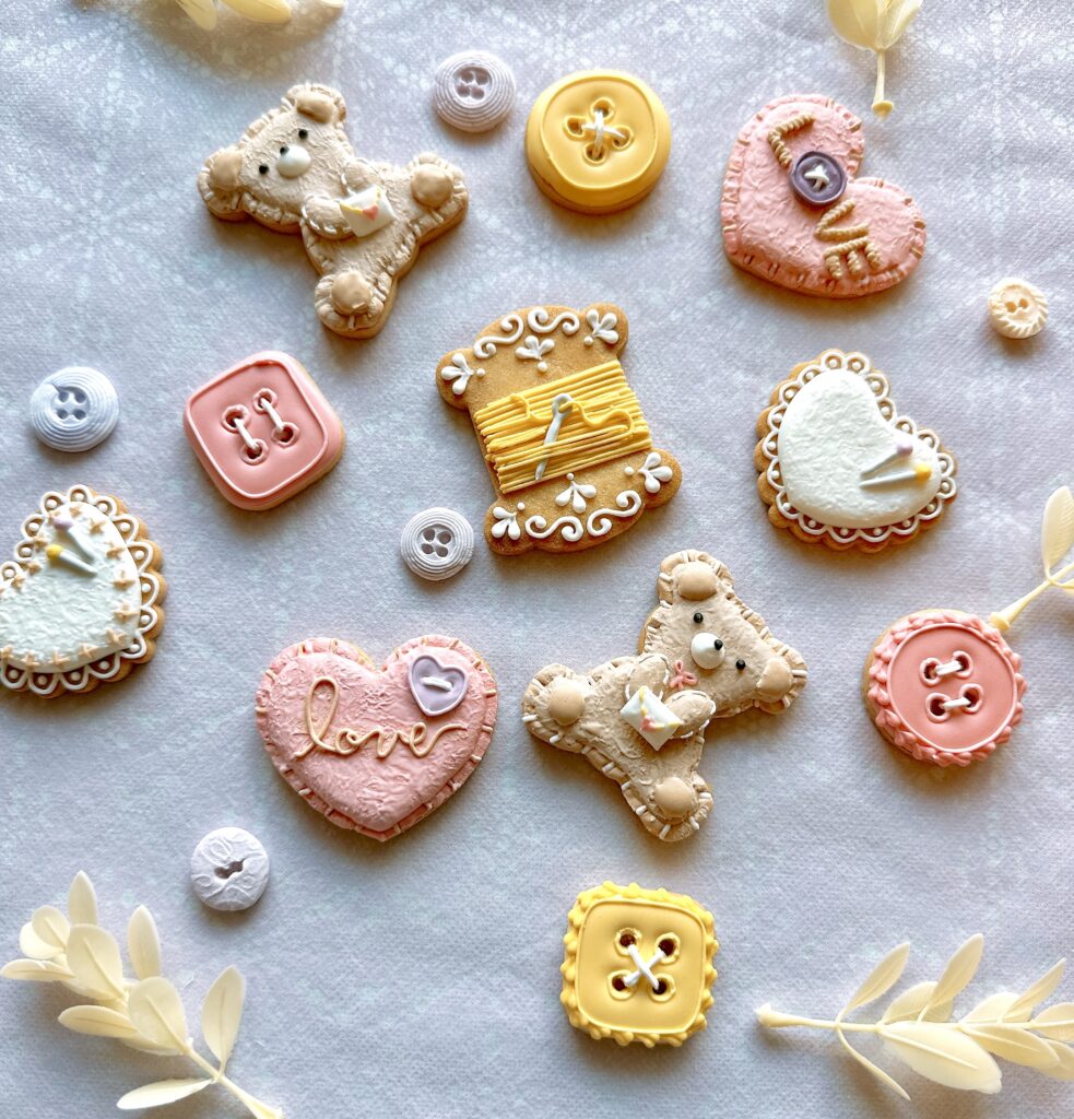 今回は、まるで本物のような温かみのあるフェルト風アイシングの他、糸巻きや針山、ボタンなど裁縫モチーフのバレンタインクッキーを仕上げます✨